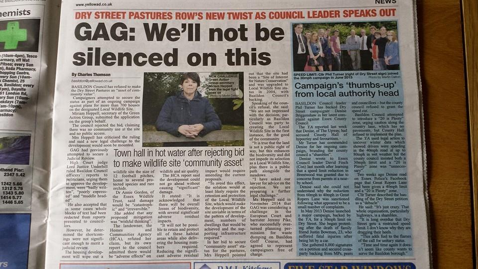 No! We Will Not Keep Quiet https://basildongag2011.org.uk/2015/04/no-we-will-not-keep-quiet/ https://basildongag2011.org.uk/2015/04/no-we-will-not-keep-quiet/#respond Fri, 03 Apr 2015 10:30:25 +0000 http://www.basildongag2011.org.uk/?p=878 There is a good article in the Yellow Advertiser this week by award winning journalist Charles Thompson which covers the refusal by Basildon Council to list Dry Street Pastures as an Asset of Community Value.